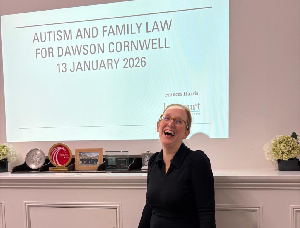 Frances Harris delivered a seminar on Autism and Family Law to Dawson Cornwell this week. With a postgraduate Certificate in Autism and lived experience as a Mother of neurodivergent children she delivered training that was both practical and informative: explaining what autism is and what it isn’t, common themes that are likely to present in cases, why identifying autism as a relevant factor can be so important and how clients can be best supported.